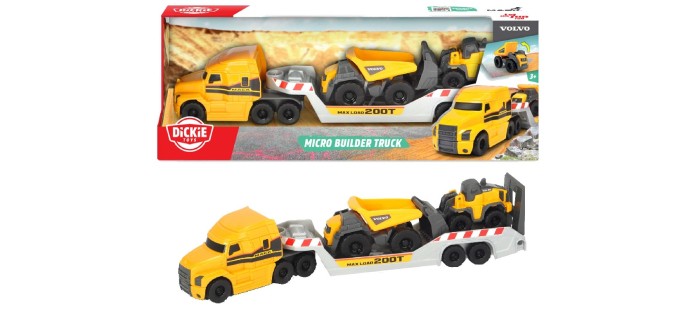 Zestaw zabawkowy Micro Builder Truck oferuje dużą powierzchnię ładunkową, która może pomieścić wywrotkę i ładowarkę kołową Volvo.