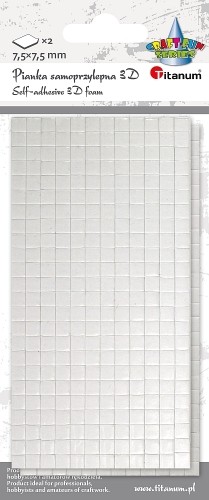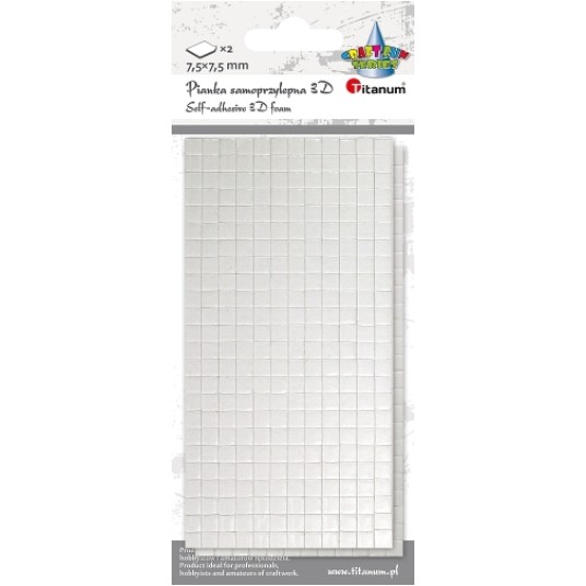 Piankowa taśma dwustronnie klejąca w formie kosteczek. Pozwala na uzyskania efektu 3D w projektach plastycznych, niezastąpiona przy tworzeniu kartek okolicznościowych i zaproszeń. Narzędzie w technice scrapbookingu i cardmakingu. Wymiary: 7,5 x 7,5 mm. 2 plansze.
