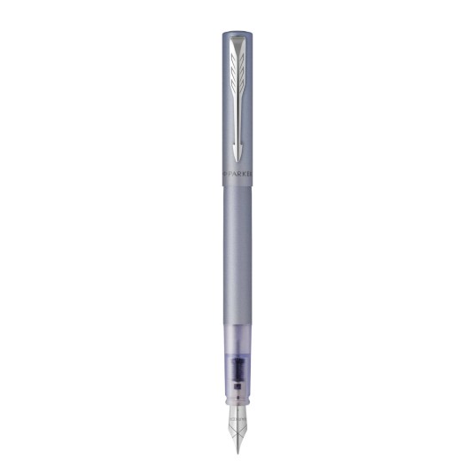 Pióro Vector XL idealnie pasuje do nowoczesnego stylu życia dzięki stylowemu wzornictwu i niezawodności. Metaliczne wykończenie w satynowym srebrno-niebieskim kolorze uzupełnione jest chromowanymi wykończeniami i charakterystycznym klipsem w kształcie strzałki PARKER. Posiada niepowtarzalny, przezroczysty korpus odsłaniający mechanizm wewnętrzny pióra. Duża, trwała stalówka ze stali szlachetnej zapewnia wygodne i płynne pisanie.