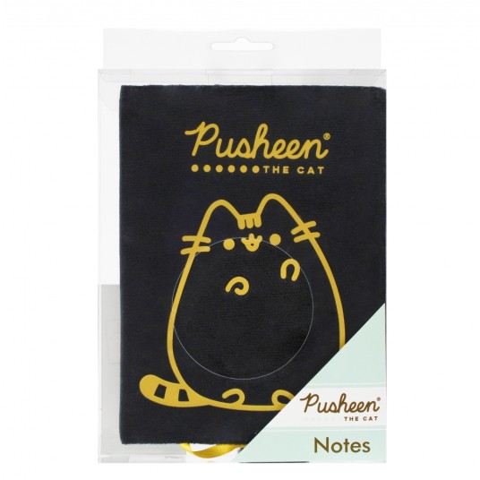 - miła w dotyku pluszowa okładka w kolorze czarnym ze złotym nadrukiem kota Pusheen,