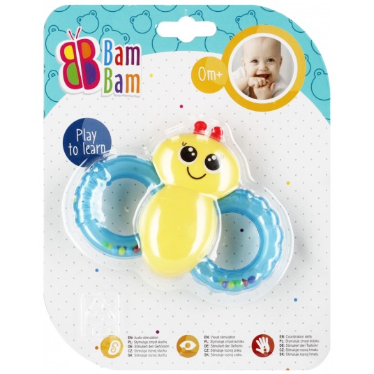GRZECHOTKA PSZCZÓŁKA BAM BAM o stonowanej kolorystyce dostarcza wiele radości dziecku już od narodzin. Potrząsanie zabawki, wywołuje charakterystyczne dźwięki uwrażliwiając je na rozróżnianie ich natężenia. Grzechotające skrzydełka Pszczółki oraz kolorowe kuleczki na pewno zaciekawią malucha . Zabawka rozwija zmysł wzroku, dotyku, słuchu oraz zdolności manualne dziecka. Zabawka przeznaczona dla dzieci w wieku: 0m+.