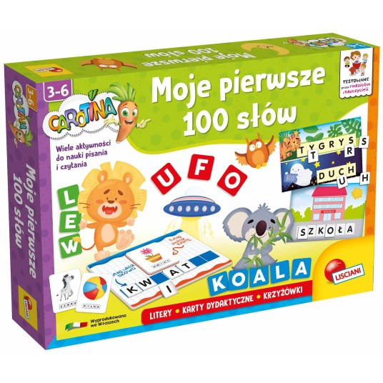 Bogaty zestaw edukacyjny, dzięki któremu przedszkolaki mogą poznać więcej niż 100 słów. Podczas zabaw dzieci razem z Carotiną układają słowa z liter! Wiele aktywności wprowadzających do czytania i pisania!