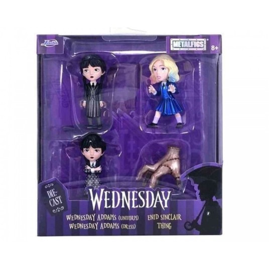 Figurki są wykonane w 100% z ciśnieniowego odlewu metalu, a są to: Rączka Thing, Wednesday w sukience w kropki, Wednesday w mundurku, Enid Sinclair przyjaciółka Wednesday.