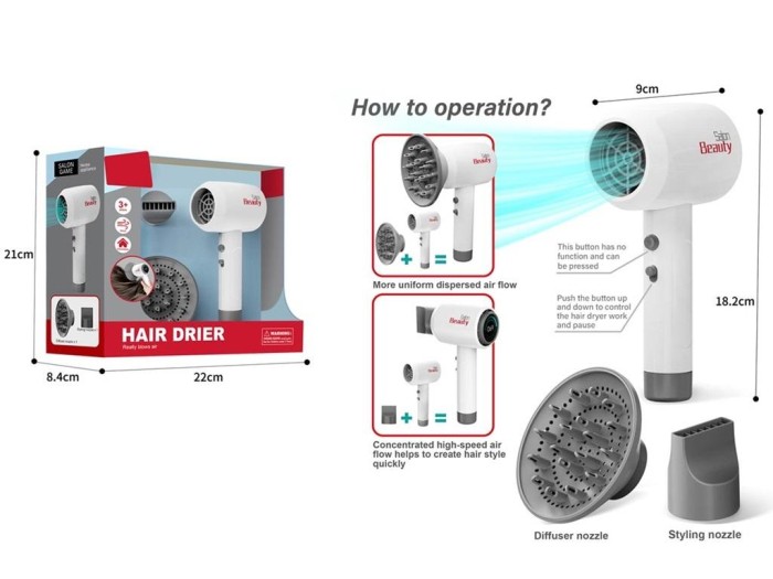 Bezpieczna zabawa – suszarka działa na jedną baterię AA (niezałączona) i wytwarza lekki, chłodny podmuch powietrza, dzięki czemu jest całkowicie bezpieczna dla dzieci.