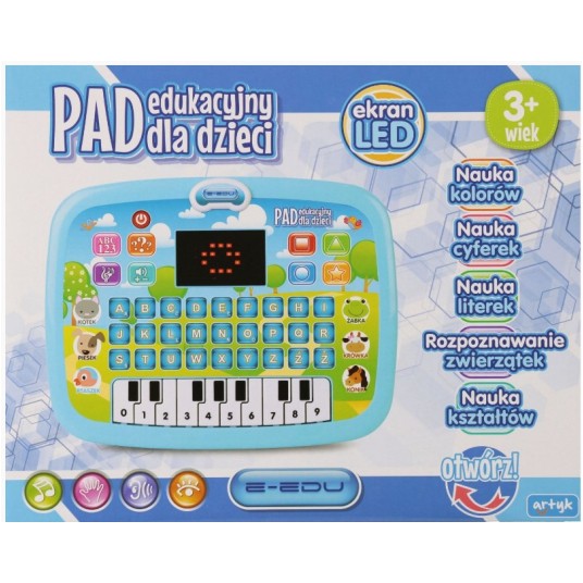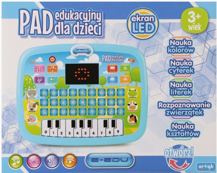 Pad posiada klawiaturę z alfabetem, pianinko z cyframi, przyciski zwierząt, kształtów, kolorów, regulację głośności, wyświetlacz LED oraz tryb quiz. Wyświetla literki, kształty i cyfry, opowiada o nowych wyrazach, zadaje pytania, zachęca do słuchania wesołych piosenek i rymowanek.