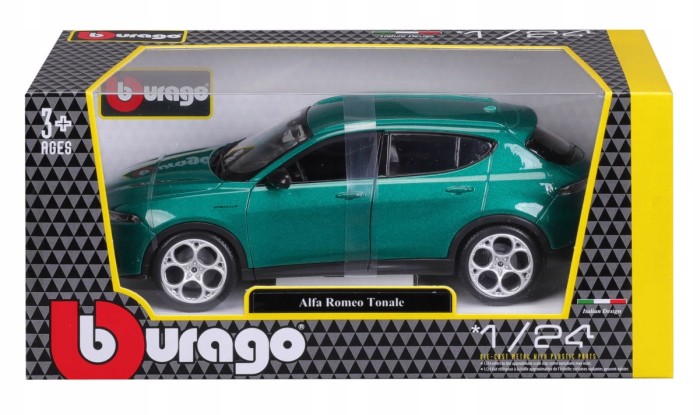 Model ALFA ROMEO TONALE wykonany został z metalu i plastiku na gumowych oponach w skali 1:24 firmy BBURAGO.