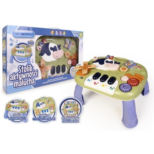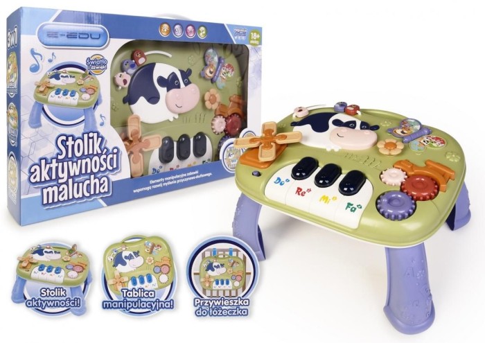 Kolorowe elementy, sympatyczna krówka i wbudowane pianinko sprawiają, że dziecko od razu ma ochotę usiąść przy stoliku i sprawdzić, co się wydarzy po kolejnym ruchu.