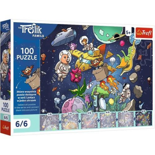 Wujcio w kosmosie (6/6), to puzzle 100 elementów i część niezwykłej kolekcji, która po złożeniu wszystkich sześciu zestawów tworzy jedną dużą, fascynującą ilustrację przedstawiającą międzyplanetarne przygody sympatycznej Rodziny Treflików.
