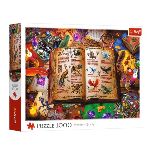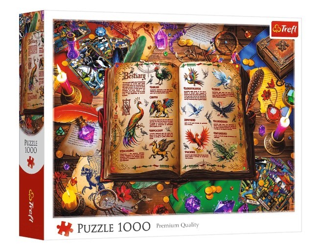 Puzzle Atlas fantastycznych ptaków, składające się z 1000 elementów, przedstawiają otwartą, bogato ilustrowaną księgę, pełną barwnych, mitycznych ptaków, otoczoną magicznymi artefaktami, świecami, kryształami i kartami, tworząc atmosferę czarodziejskiego warsztatu.