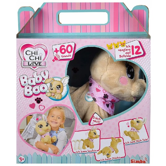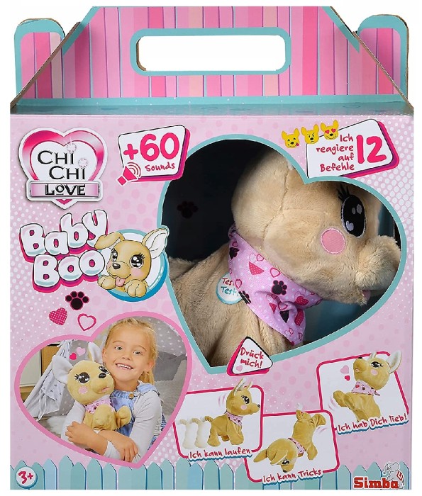 Interaktywny Piesek Baby Boo z serii Chi Chi Love to wspaniały towarzysz zabaw i prawdziwy przyjaciel dzieci. Wystarczy okazać mu odrobinę miłości, zabrać do domu, a na pewno zamieni każdą chwilę w cudowną przygodę. Pluszowy piesek wygląda jak prawdziwy szczeniak Chihuahua, uszyty został z przyjemnego w dotyku pluszu, dlatego przytulanie jego to niezwykła przyjemność. Niewątpliwie uroku dodaje mu różowa chustka z motywem serduszek i psich łapek. Baby Boo reaguje na 12 poleceń i wydaje ponad 60 różnych efektów dźwiękowych jak prawdziwy szczeniak. Słodki piesek uwielbia się przytulać i jest bardzo zabawny! Słucha Twoich poleceń i reaguje na Twój głos jak prawdziwy pupil. Chętnie pokaże Ci to, o co go poprosisz a nawet zaśpiewa dla Ciebie! Potrafi też robić sztuczki oraz stać na głowie. A ponieważ tak bardzo Cię kocha, to okazuje te uczucia. Będziecie się razem świetnie bawić! W opakowaniu znajduje się instrukcja, która wyjaśnia jak bawić się z Baby Boo.