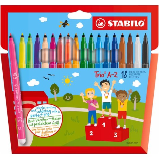 STABILO Trio A-Z - flamastry z ergonomicznym, trójkątnym uchwytem oraz mocną, odporną na złamanie końcówką. Flamastry posiadają wentylowaną skuwkę oraz łatwo zmywalny tusz, który bez problemu można usunąć z dłoni oraz ubrań. Grubość linii 0,7 mm. Kartonowe etui zawierające 18 szt.