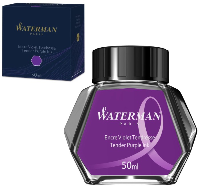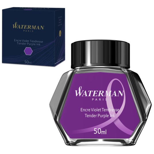 Atrament fioletowy w butelce o pojemności 50 ml do napełniania piór wiecznych Waterman.