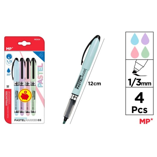 Zakreślacz korpus długopisu wykonany z przeźroczystegotworzywa w kolorze tuszu. Czapka zklipsem zabezpieczającym. Odporna końcówka o dwóchszerokościach linii: 1 i 3 mm. Atrament na baziewody o wysokiej jasności w pastelowych kolorachdo podkreślania tekstów. Rozmiar 120 mm. Blister4 pastelowych jednostek: niebieski, fioletowy,różowy i zielony.