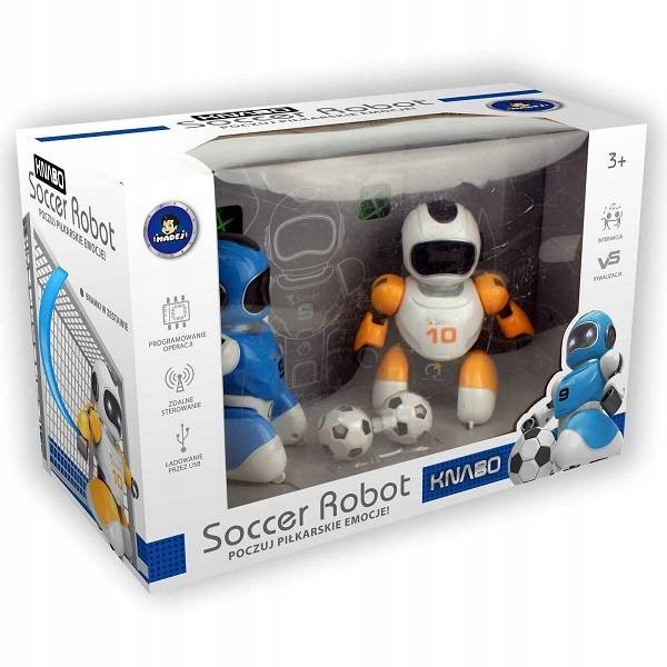 W zestawie znajdziesz 2 roboty, 2 piloty sterujące, elementy do budowy boiska wraz z 2 bramkami.