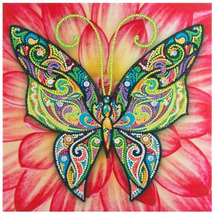 Diamond painting (haft diamentowy / mozaika diamentowa), to po prostu przyklejanie diamencików jednego po drugim za pomocą pisaka do pasujących numerów na szablonie motywu. Gotowy obrazek ma wymiary 30 × 30 cm i jest zadrukowany pięknym motylim wzorem. Po ukończeniu prac obraz można oprawić w ramkę i powiesić na ścianie.