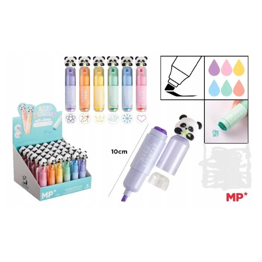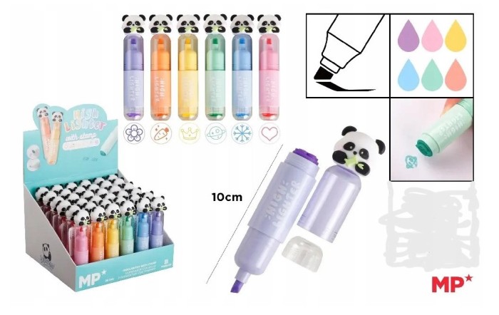 Mini zakreślacz fantasy dostępny w 6 pastelowych kolorach: fioletowym, różowym, żółtym, niebieskim, zielonym i pomarańczowym. Każdy zakreślacz ma dodatkowo stempelek w kolorze tuszu: fioletowy - kwiatek, pomarańczowy - marchewka, żółty - korona, zielony - planeta, niebieski - śnieżynka, różowy - serduszko.