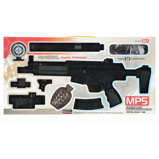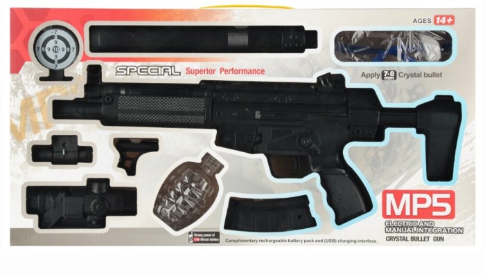 Zawartość zestawu: karabin plus akcesoria tj.: tłumik do karabinu, kulki hydrożelowe, tarcza, gogle ochronne, kabel USB 7,4V, laser.