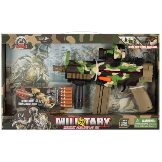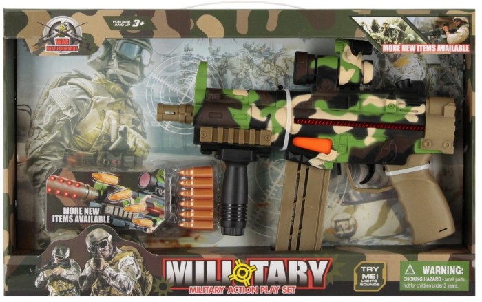 Pistolet karabin z efektami świetlnymi oraz dźwiękowymi. Po naciśnieciu spustu w realistyczny sposób wylatują łuski od nabojów.