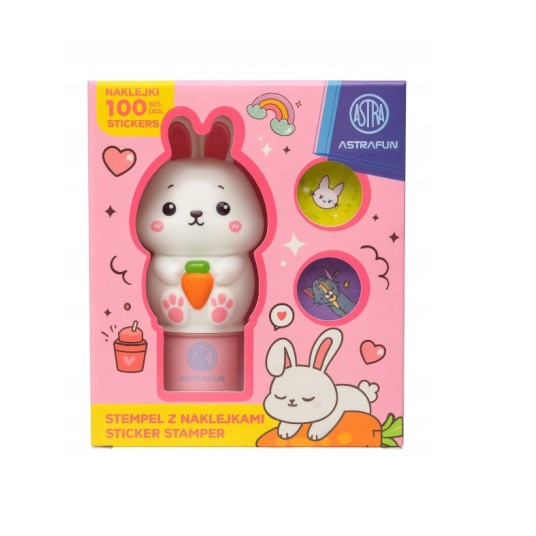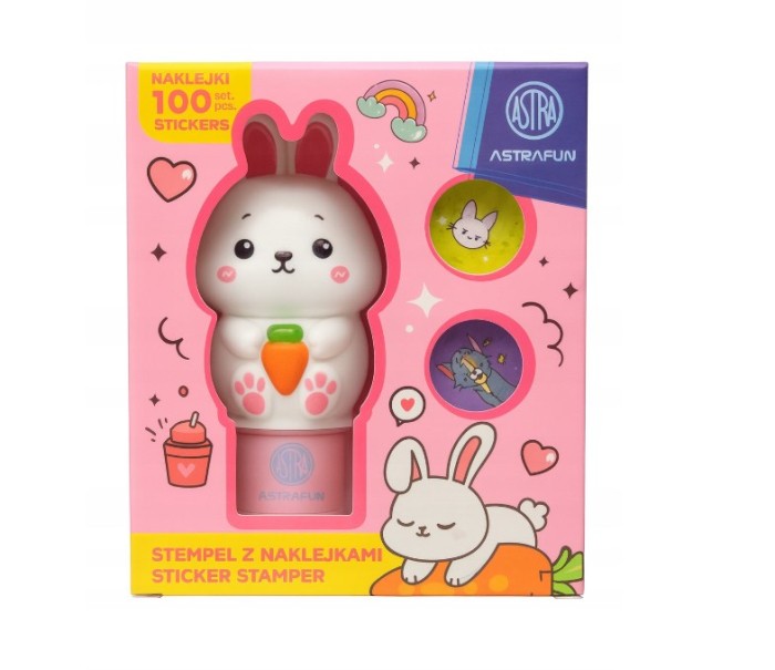 Stempel z naklejkami Astra to wyjątkowy zestaw, który zapewni dzieciom długie godziny twórczej i radosnej zabawy. Uroczy stempel w formie króliczka z marchewką skrywa aż 100 kolorowych naklejek wielokrotnego użytku, które można dowolnie przyklejać i odklejać bez ryzyka uszkodzenia powierzchni. Do zestawu dołączona jest tematyczna książeczka, która inspiruje do tworzenia zabawnych scenek i rozwijania wyobraźni. Zestaw doskonale sprawdzi się zarówno w domu, jak i podczas podróży.