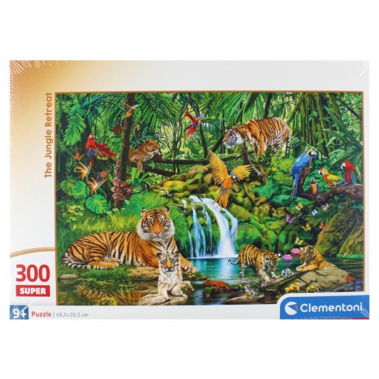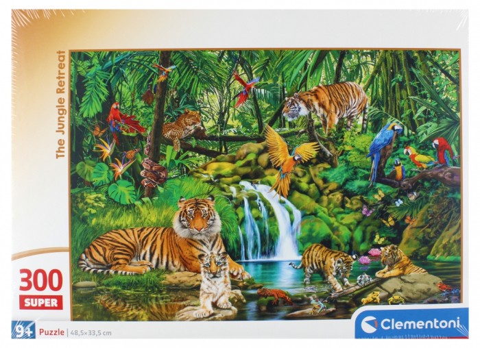 Puzzle składające się z 300 elementów to prawdziwe wyzwanie dla każdego małego miłośnika układania. Wysokiej jakości puzzle odznaczają się żywymi, przyciągającymi uwagę dziecka barwami, które uzyskano dzięki wykorzystaniu technologii Super Kolor. Po ułożeniu układanki powstanie obrazek o wymiarach 48,5x33,5cm, przedstawiający odosobnienie w dżungli. Układanie puzzli to rozwijająca aktywność, która wycisza i ćwiczy koncentrację dziecka. Ponadto uczy najmłodszych spostrzegawczości oraz rozwija ich zdolności manualne i umiejętność logicznego myślenia. Z każdym kolejnym puzzlem dopasowanym do układanki zaczynamy dostrzegać powstający obrazek, co sprawia ogromną satysfakcję. Puzzle zapewnią dziecku wiele godzin wspaniałej zabawy w układanie i będą doskonałym prezentem z okazji urodzin, Dnia Dziecka lub świąt. Wszystkie elementy układanki zostały umieszczone w solidnym, tekturowym pudełku.