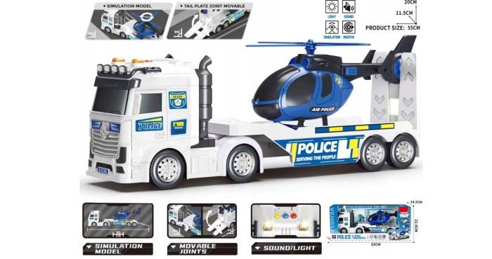 Przygotuj się na pełną emocji akcję w zaciszu swojego salonu! Nasz zestaw Samochód ciężarowy z naczepą, na której umieszczony jest helikopter wojskowy to zabawka, która wprowadzi Twoje dziecko w świat wojskowych przygód i militariów. Dzięki dokładnemu odwzorowaniu, klasyczna zieleń i czarne elementy z napisami wojskowymi sprawią, że maluch poczuje się jak prawdziwy żołnierz. Zestaw posiada liczne funkcje zarówno manualne jak i świetlne i dźwiękowe.