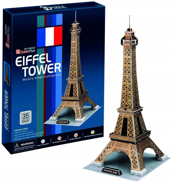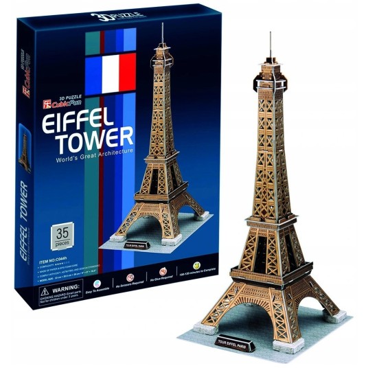 PUZZLE 3D WIEŻA EIFFEL'A, to pasjonująca zabawa dla dzieci oraz kolekcjonerów architektury z różnych stron świata. W opakowaniu znajduje się 39 EL. puzzli, wykonanych ze specjalnego materiału przypominającego piankę. Puzzle są ponumerowane, ponacinane i umieszczone na arkuszach. Wystarczy bez użycia siły wycisnąć element z arkusza i zmontować go zgodnie z dołączoną instrukcją, bez użycia kleju ani specjalnych narzędzi. Wielkość budowli po złożeniu 20.5 x 23 x 47 cm. Zalecany wiek dziecka 3+. Obecnie na stanie posiadamy dwie wersje kolorystyczne, różniące się wielkością, jednak przedstawiające ten sam budynek. Obie wersje przedstawione są na zdjęciach.