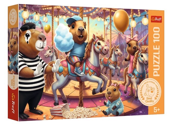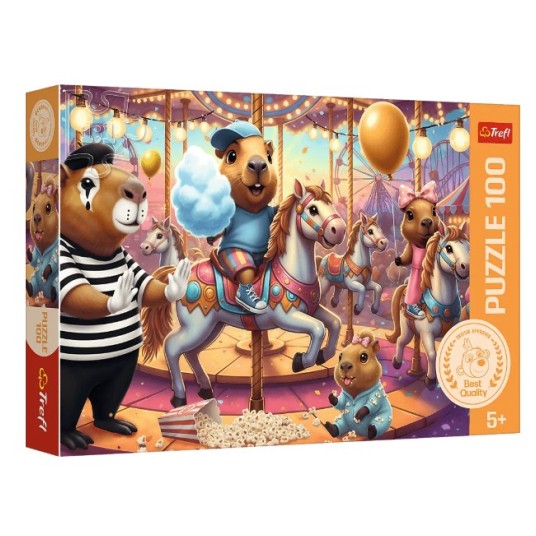 Kapibary na wakacjach to puzzle składające się ze 100 elementów, zaprojektowane z myślą o małych fanach tych uroczych zwierzaków. Po ułożeniu układanki powstanie obrazek o wymiarach 410x275 mm, przedstawiający Kapibary bawiące się w wesołym miasteczku.