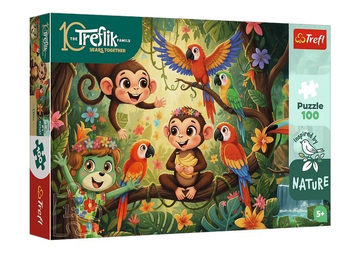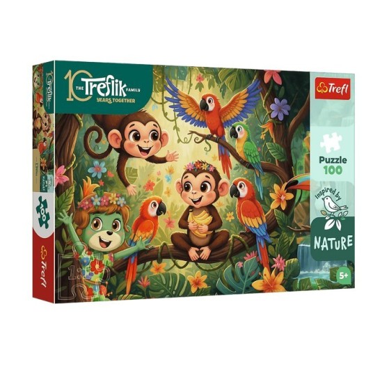 Małpki i przyjaciele to puzzle składające się z 100 elementów, zaprojektowane z myślą o małych fanach bajki Rodzina Treflików. Po ułożeniu układanki powstanie obrazek o wymiarach 410x275 mm.