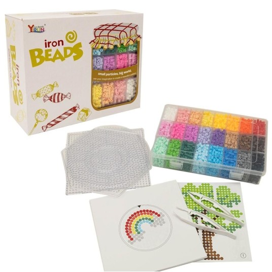 Zestaw zawiera: 24 kolory koralików, 3 podkładki (kwadrat, koło i sześciokąt), 40 dwustronnych kart pracy, 2 pęsety, 2 arkusze papieru do prasownia, kolorowy sznureczek, zawieszki, breloczki.