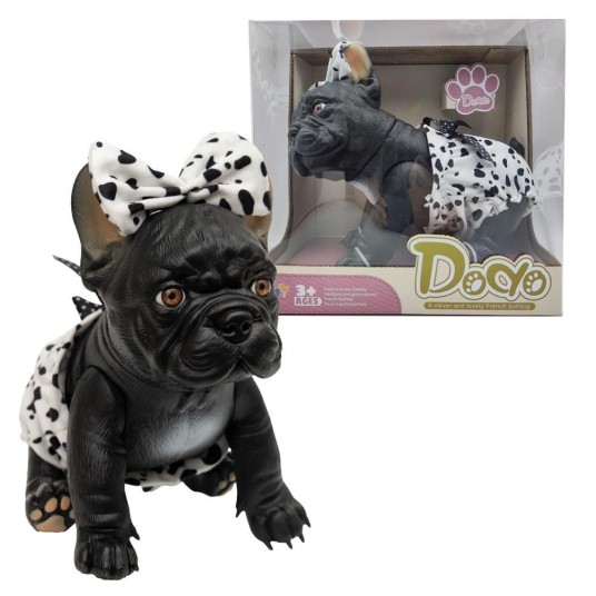 Lalka w formie czarnego buldoga francuskiego ma realistyczne detale, dzięki czemu wygląda jak prawdziwy szczeniak.