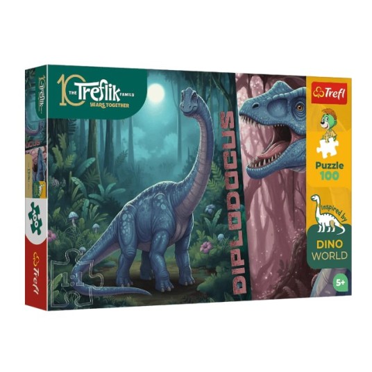 Diplodocus to puzzle składające się z 100 elementów, zaprojektowane z myślą o małych fanach dinozaurów. Po ułożeniu układanki powstanie obrazek o wymiarach 410x275 mm.