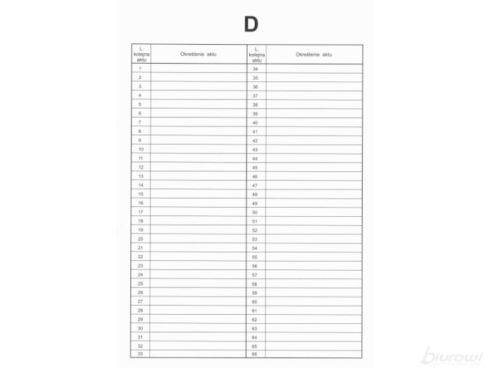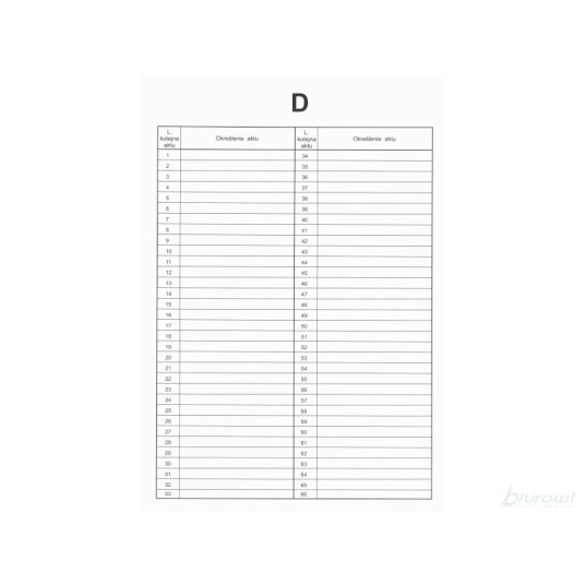 Wkładka do akt osobowych D Tierra 10 sztuk Wkład do teczki akt osobowych o symbolu "D". Wkład posiada 66 pozycji do uzupełnienia konkretnymi aktami. Cechy: - 66 pozycji - Ergonomiczna szerokość wierszy - Wymiary: 225x305 mm - Przekładki posiadają 2 otwory do wpinania w zamek segregatorowy dwuringowy. - Przekładki wykonane z białego kartonu o gramaturze 170 g/m2 - Zgodne z ustawą RODO z dnia 19 grudnia 2018 roku - w części D - przechowywane są oświadczenia i dokumenty związane z rozwiązaniem albo wygaśnięciem stosunku pracy - Jednostka Sprzedaży: Opakowanie (10 sztuk)