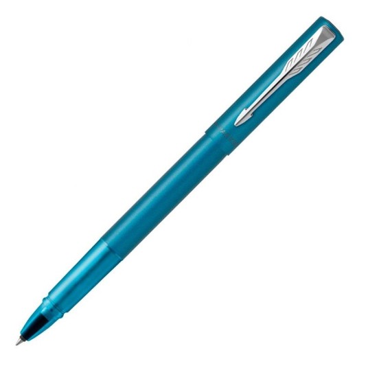 Metaliczne wykończenie w satynowym srebrno niebieskim kolorze uzupełnione jest chromowanymi wykończeniami i charakterystycznym klipsem w kształcie strzałki PARKER.