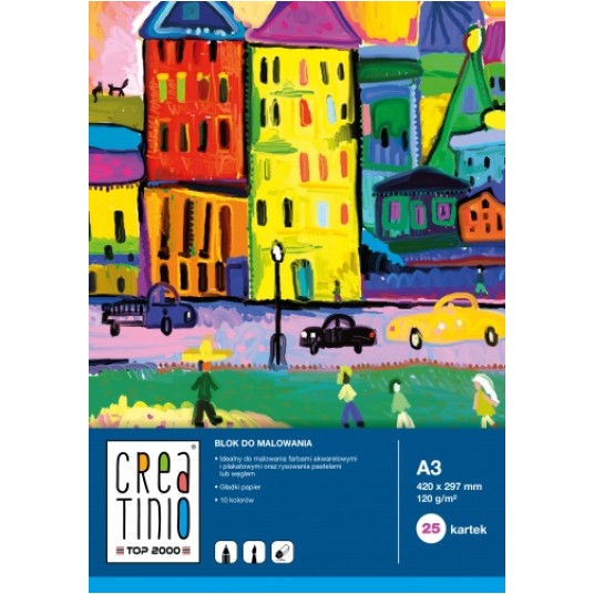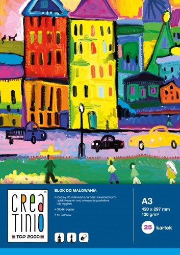 Idealny do malowania farbami akwarelowymi i plakatowymi oraz rysowania pastelami lub węglem,blok zawiera 20 arkuszy papieru w formacie A4, masa papieru 120 g/m2.
