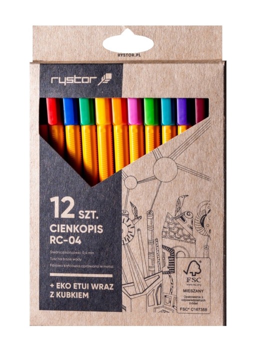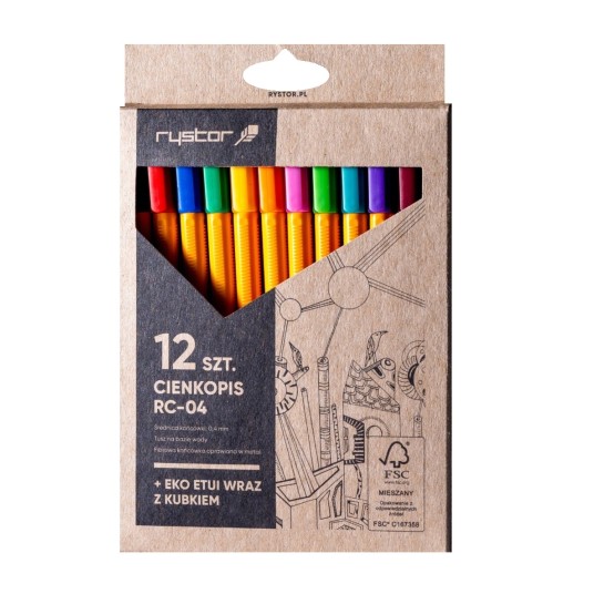 Zestaw 12 cienkopisów z fibrową końcówką, w ekologicznym opakowaniu kartonowym, wykonanym z odpowiedzialnych źródeł.