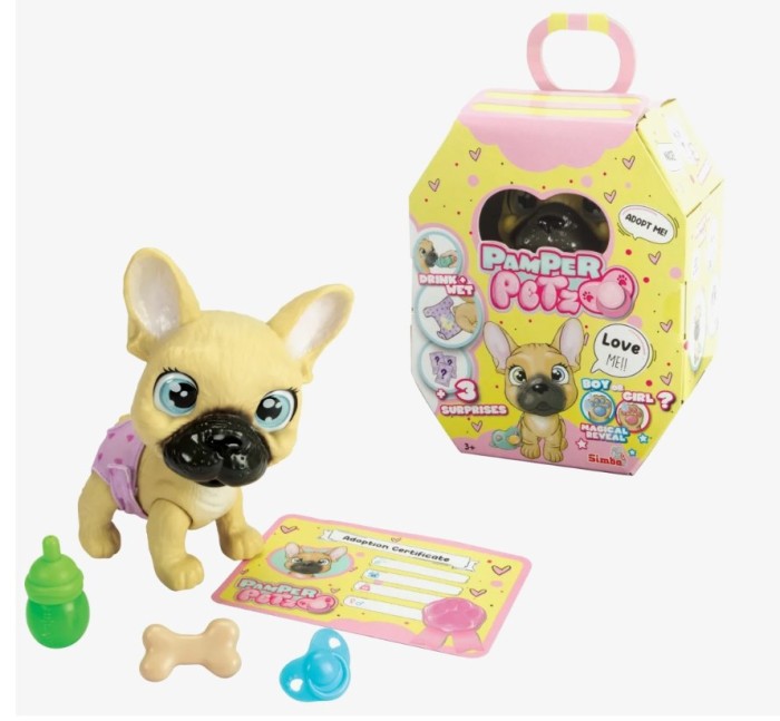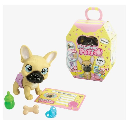 Buldog francuski z kolekcji Pamper Petz potrafi pić prawdziwą wodę z buteleczki i siusiać w swoją pieluszkę, która zmienia kolor, gdy się ją zmoczy. Potrafi także trzymać akcesoria w pyszczku! Zwierzak ma magiczną łapkę, która w magiczny sposób podpowiada czy to chłopczyk czy dziewczynka. Po przetarciu łapki wodą, odbarwia się na kolor niebieski lub różowy, dzięki czemu dzieci poznają płeć swojego szczeniaka.