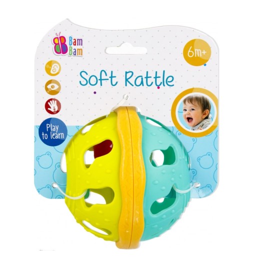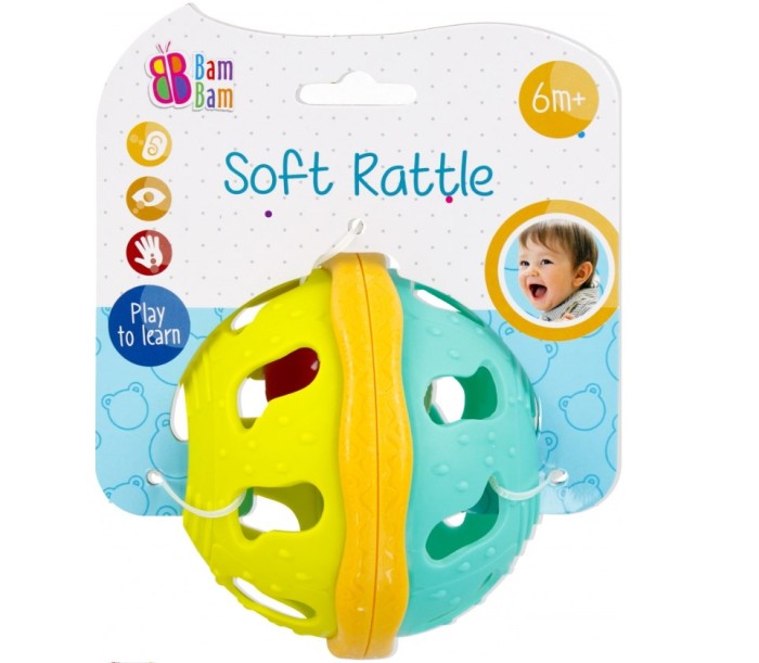 KULA Z GRZECHOTKĄ BAM BAM to idealna zabawka edukacyjna dla dziecka od 6 miesiąca życia. Wykonane z miękkiej i plastycznej gumy, z nieregularnymi otworami, w pełni umożliwiającymi chwytanie kuli przez małe rączki. Podczas manewrów chwytania, ugniatania, turlania oraz potrząsania, kula wydaje dźwięki, dzięki umieszczonej we wnętrzu grzechotce. Faktura i właściwości materiału, z jakiego została wykonana kula, pozwala im zawsze powracać do pierwotnego kształtu. Boczne uchwyty z kolorowymi obręczami są dodatkowym elementem, który rozwija zdolności manualne oraz urozmaica zabawę. Zabawka wpływa na rozwój wielu zmysłów, między innymi słuchu, wzroku oraz zdolności motorycznych.