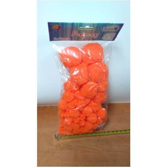 Pompony w mixie wielkościowym,. pomarańczowe. op. zawiera 80 szt.. o 1,5 cm - 30 szt.. o 2 cm - 20 szt.. o 2,5 cm - 20 szt.. o 3,8 cm - 6 szt.. o 5 cm - 4 szt.. Sposób pakowania 1/12/144