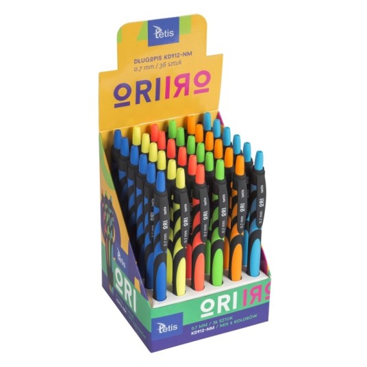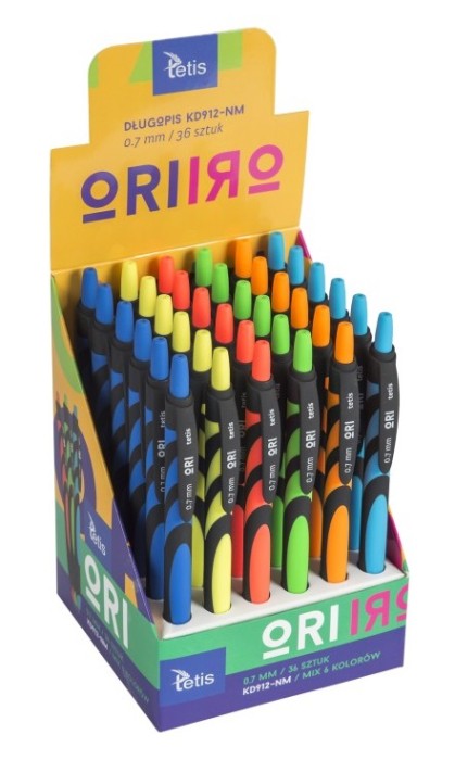 Długopis automatyczny ORI wyposażony w końcówkę igłową i miękko piszący wkład olejowy na niebiesko.