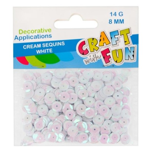 Zalety produktów: można zaprojektować własne ozdoby lub dekoracje, idealne do wykonywania wszelkich prac dekoratorskich, jak również do zabaw plastycznych, do wzbogacenia ozdób wykonanych techniką decoupage. Używaj tych produktów w połączeniu z innymi akcesoriami oraz kompletami z serii CRAFT WITH FUN! Zawartość opakowania: kremowe, okrągłe cekiny w białym kolorze o średnicy 8 mm. W opakowaniu znajduję się 14 g. cekinów. Cekiny wykonane z plastiku. Wymiary/waga: wymiary opakowania (dł. x wys. x gł.) [cm]: 10x12x1, waga produktu w opakowaniu [kg]: 0,04 kg. Produkt przeznaczony dla dzieci w wieku: 3+. Pakowany w woreczek z zawieszką. W inerze po 40 szt. W kartonie zbiorczym po 400 szt.