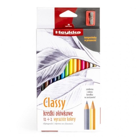 Kredki ołówkowe w 14 kolorach, wykonane z najwyższej jakości drewna topoli są niezwykle lekkie i łatwe w temperowaniu. Umieszczone w plastikowej tacce, pomagającej utrzymać kredki w porządku. Wytrzymały i odporny na złamania grafit klejony na całej długości kredki. Wysokiej jakości pigmenty gwarantują nasycone kolory oraz doskonałe właściwości kryjące. Ergonomiczny, trójkątny przekrój kredki. Średnica grafitu 4 mm. Złota i srebrna kredka w zestawie. Temperówka dołączona do opakowania.